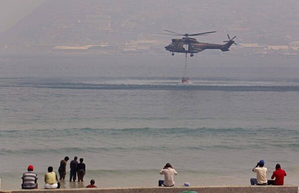 A helicopter collects water in the ocean near a beach as it battle's a fire near the town of Hout Bay, Cape Town, South Africa.Schalk van Zuydam/The Associated Press