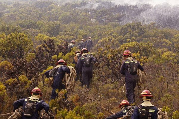 Firefighters stand among smouldering fynbos along Cape Town's scenic Chapman's Peak Drive.Mike Hutchings/Reuters
