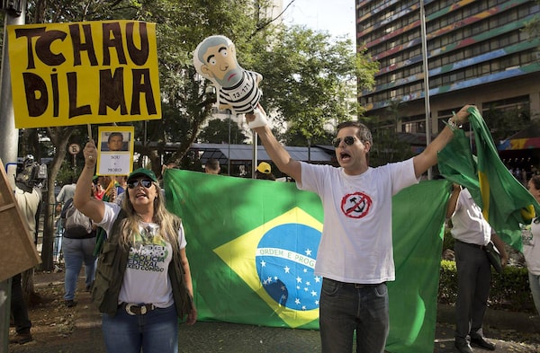 A woman holds a sign that reads ‘Bye Dilma’ next to a man holding a puppet of Brazil’s former president Luiz Inacio Lula da Silva.Andre Penner/The Associated Press