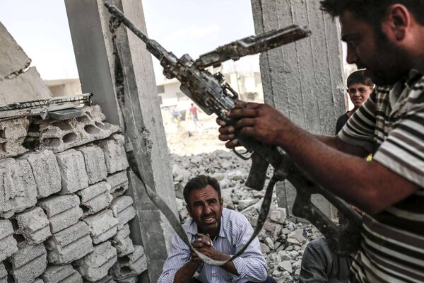 A man carries a seized weapon from Islamic State on September 6, 2015 in Kobane, northern Syria.YASIN AKGUL/AFP / Getty Images
