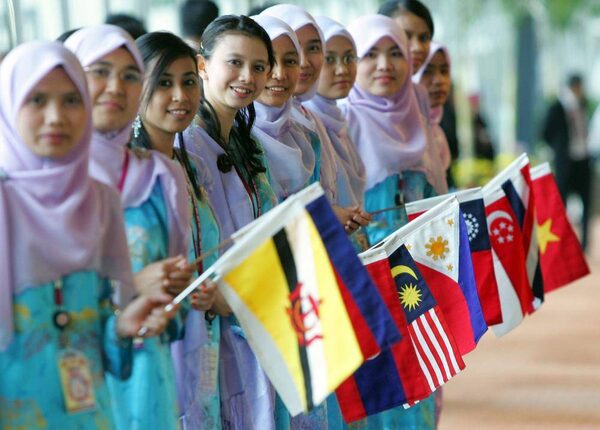 Malaysians in traditional dress hold flags of Association of Southeast Asian Nations (ASEAN) countries during the its 39th ministerial meeting in Kuala Lumpur in this July 25, 2006 file photo.BAZUKI MUHAMMAD/Reuters