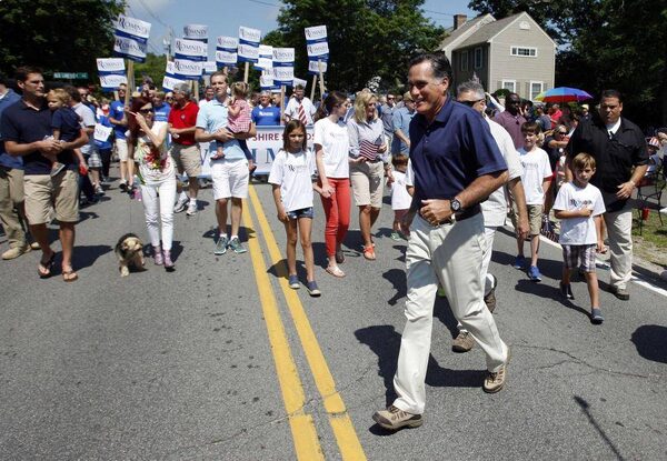 U.S. Republican presidential candidate and former Massachusetts Governor Mitt Romney crosses the street as he takes part in the Wolfeboro Fourth of July Parade in Wolfeboro, New Hampshire July 4, 2012.JESSICA RINALDI/Reuters
