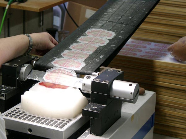 Researchers use a microtome to cut sections from a brain preserved in paraffin wax into slivers 20-micrometers thick, resulting in over 7,400 slices. The Associated Press