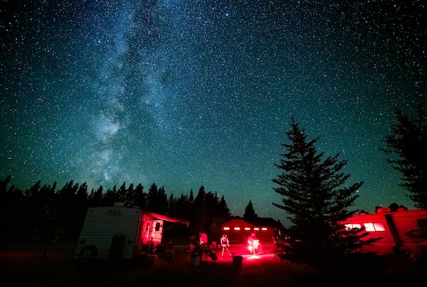 The Milky Way overhead with red lights below revealing where people have set up their telescopes for a night of observing at Cypress Hills Interprovincial Park on Aug 24, 2025. Fred Lum/The Globe and Mail