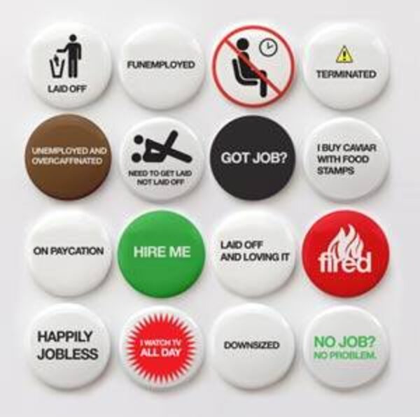Even though times couldn't be tougher, no one said we couldn't have any fun. San Francisco-based graphic designer Irina Blok has the right idea. Her set of Funemployed one-inch buttons is currently making the viral rounds online and makes the perfect antidote for the laid off blues. All levels of desperation are accommodated, from a relaxed "No job? No problem," to a plea of "Hire me," to the truly frustrated shout of "Need to get laid, not laid off."