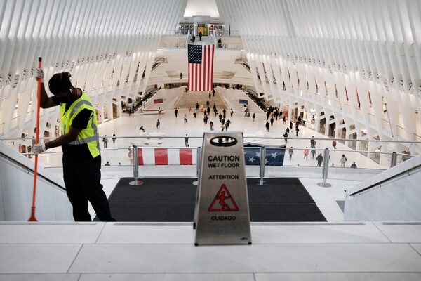 New York, then and now: At top, a man with a fire extinguisher looks at the rubble of the first World Trade Center tower in 2001, and at bottom, people walk through the Oculus Mall, also known as the World Trade Center Transportation Hub, earlier this month.Doug Kanter/AFP/Getty Images; Spencer Platt/Getty Images