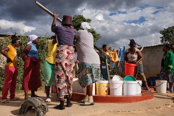 Letwin Mhande, a 36-year-old mother of four takes her turn to load an allocation of four buckets of water per family per day at a community run borehole in Epworth, an informal settlement east of the Zimbabwe capital Harare, on May 23.JEKESAI NJIKIZANA/Getty Images
