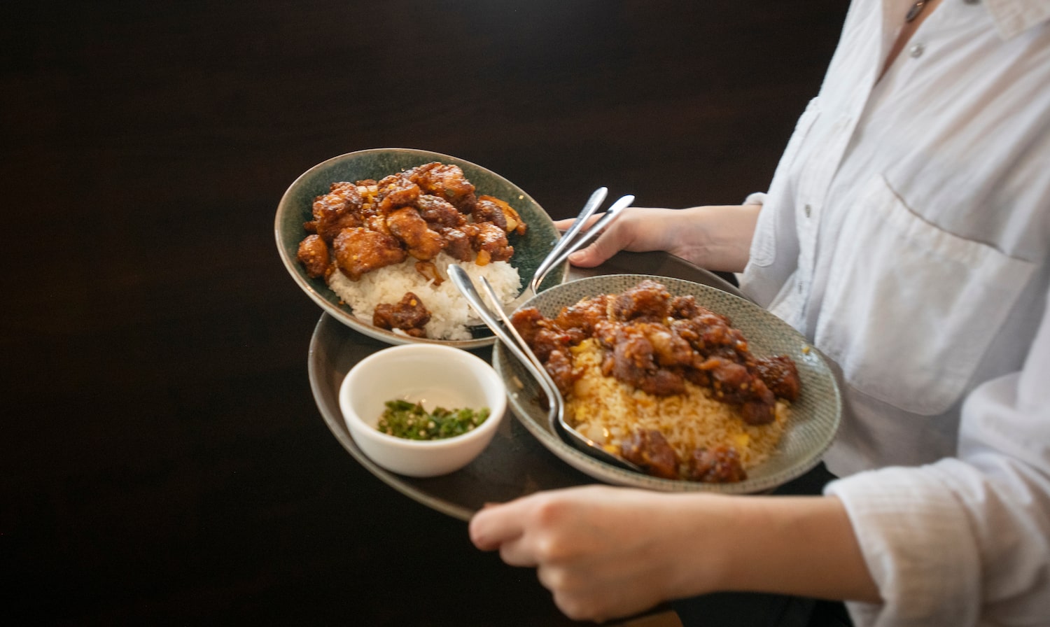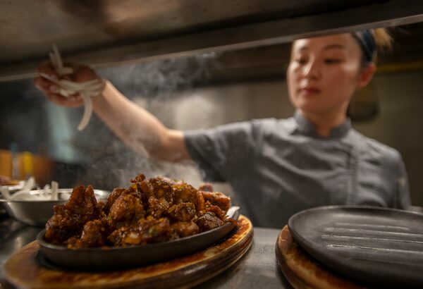 Joanna Liu plates an order of sizzling chili chicken.