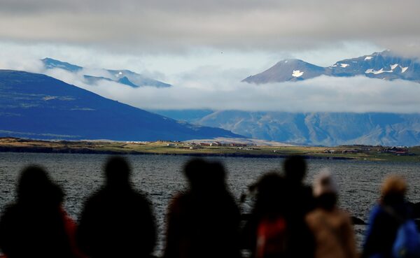 Out and about in Reykjavík in 2018, when tourism was still in full swing: At top, tourists walk along the seaside, and at bottom, they explore a pond whose surface was frozen in a ripple pattern.Photos: Hannibal Hanschke and Lucas Jackson/Reuters