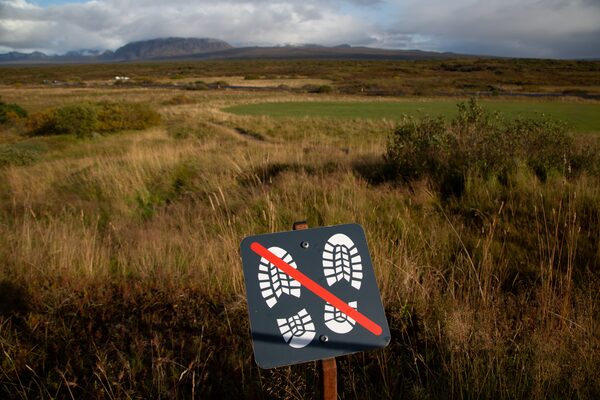 A sign warns tourists not to walk in an area at Thingvellir National Park where a rift valley exposes the North American and Eurasian tectonic plates.Chris Helgren/Reuters