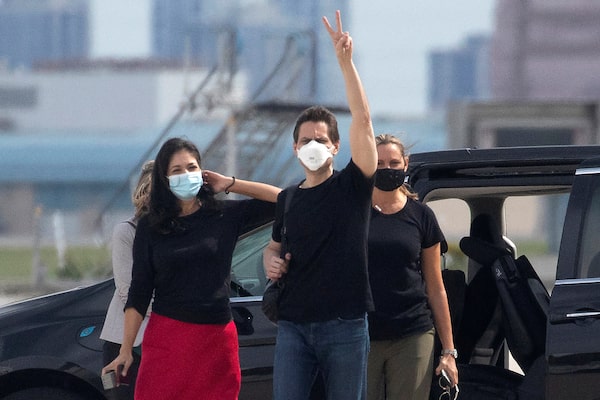 Former diplomat Michael Kovrig gestures after arriving at Toronto Pearson International Airport, on Sept. 25.CHRIS HELGREN/Reuters