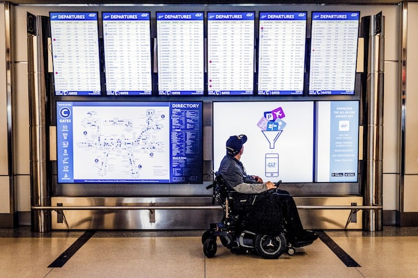 A traveller checks the status of his flight during a layover in Charlotte, N.C., on May 5. U.S. airlines damage or destroy an average of 29 mobility devices every day.Scott McIntyre/The New York Times News Service
