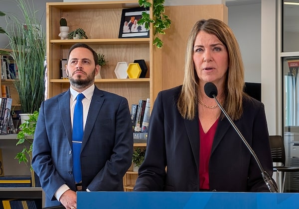 Alberta Premier Danielle Smith and Education Minister Demetrios Nicolaides speak at a news conference at Bow Valley High School in Cochrane, Alta., on March 5.Dayne Patterson/The Canadian Press