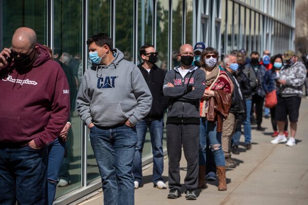 People line up outside an immunization clinic in Edmonton to get their Oxford-AstraZeneca COVID-19 vaccine on April 20, 2021.JASON FRANSON/The Canadian Press