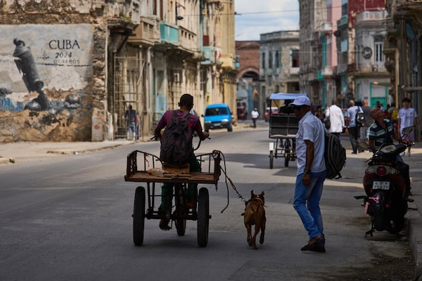 A man rides a tricycle with his dog running alongside him during a blackout in Havana on Monday. It was the country's third major blackout over the past four months.Ramon Espinosa/The Associated Press