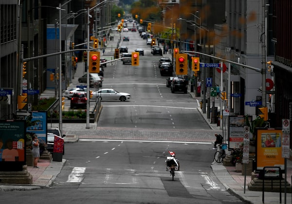 A recumbent cyclist pauses at a stop light along O'Connor Street in Ottawa, on July 19, 2020, in the midst of the COVID-19 pandemic.Justin Tang/The Canadian Press