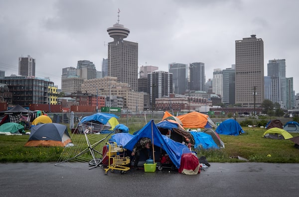 A man sits in a tent at a homeless camp on Port of Vancouver property on June 10, 2020.DARRYL DYCK/The Canadian Press