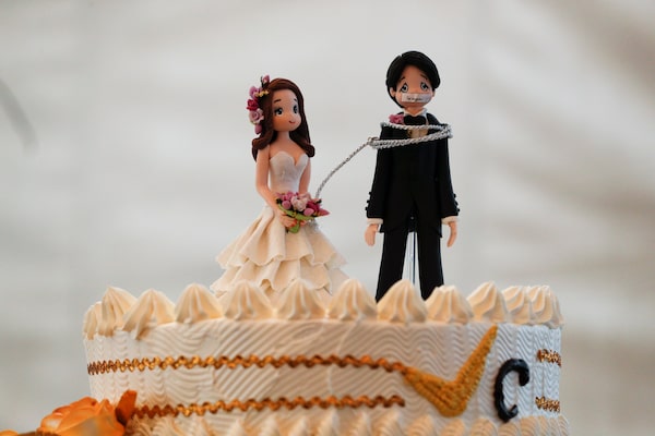 Mexico City, 2019: Figures of a bride and her captive bridegroom, his mouth covered with tape inscribed with 'Yes, I accept!' in Spanish, stand atop a giant multi-tiered wedding cake during a mass wedding ceremony on Valentine's Day.Rebecca Blackwell/The Associated Press/The Associated Press