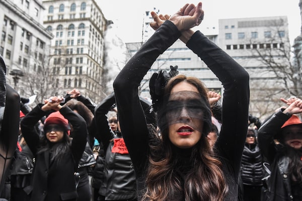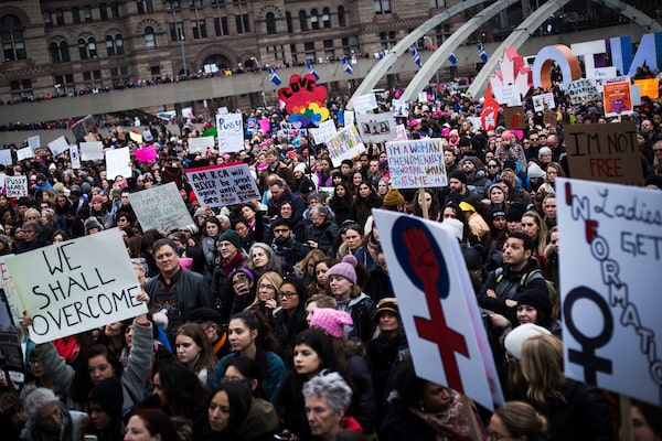Toronto, 2017: Protesters cheer at Nathan Phillips Square at a solidarity rally with the Women's March in Washington, where Donald Trump was then beginning his first full day as U.S. President. Mr. Trump's rise to power, despite allegations of sexual misconduct and misogynist remarks before and during the 2016 election, built a new momentum of anger among feminists around the world.Melissa Renwick/The Globe and Mail