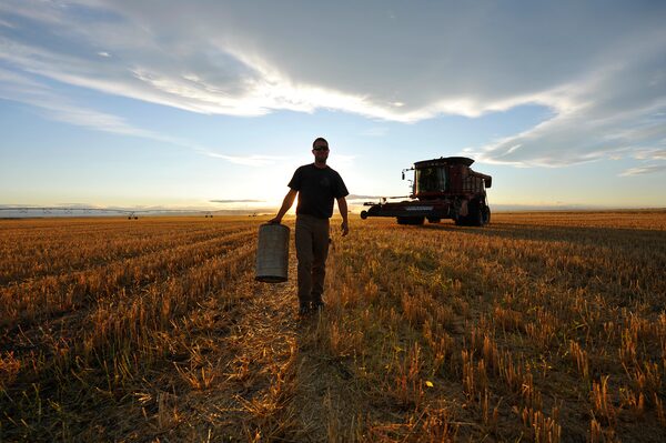 A worker carries an air filter during wheat harvest on the Stephen and Brian Vandervalk farm near Fort MacLeod, Alberta, Sept. 26, 2011.© Todd Korol / Reuters/Reuters