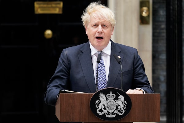 British Prime Minister Boris Johnson reads a statement outside 10 Downing Street, in London, on July 7.Alberto Pezzali/The Associated Press