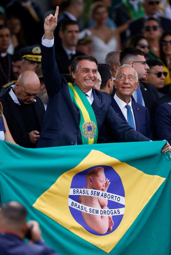 Mr. Bolsonaro holds a flag reading 'Brazil without abortion, Brazil without drugs' at Sept. 7's rally in the capital, Brasilia.Adriano Machado/Reuters