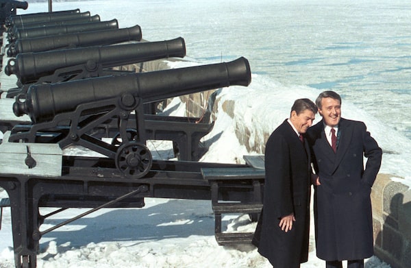 It helped that both had family roots in Ireland, which led Mr. Reagan, in Mr. Mulroney’s first visit to the White House as prime minister, to speak of himself as “the other North American Irishman.” Their Quebec City meeting the next year inevitably came to be called the Shamrock Summit. The two – one a showman by profession, the other by inclination – and their wives joined in a chorus of When Irish Eyes Are Smiling. Both animated by a strong streak of optimism, they seemed eager to prove that, as the ballad says, “You can hear the angels sing / When Irish hearts are happy.”