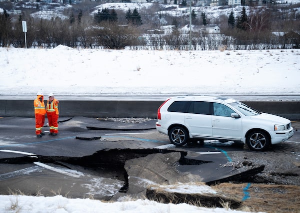 City crews assess damage to the Trans-Canada Highway from a water main break in Calgary, on Dec. 31, 2025.Todd Korol/The Globe and Mail