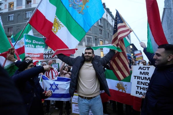An Iranian protester tears up a flag during a demonstration in front of the U.S. Consulate in Milan, Italy, on Tuesday.Luca Bruno/The Associated Press