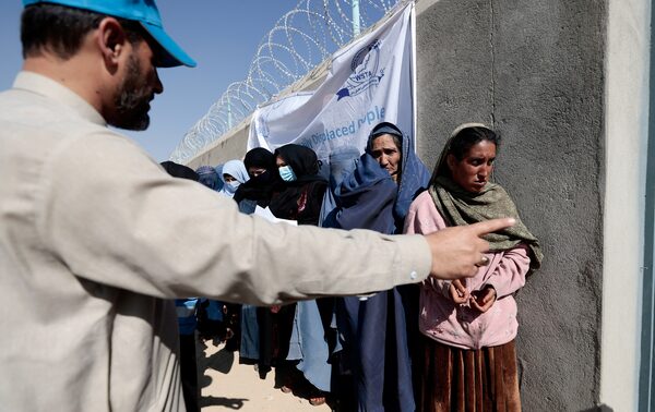 An UNHCR worker directs displaced Afghan women into an UNHCR distribution centre to receive aid supply on the outskirts of Kabul, Afghanistan, Oct. 28, 2021.ZOHRA BENSEMRA/Reuters