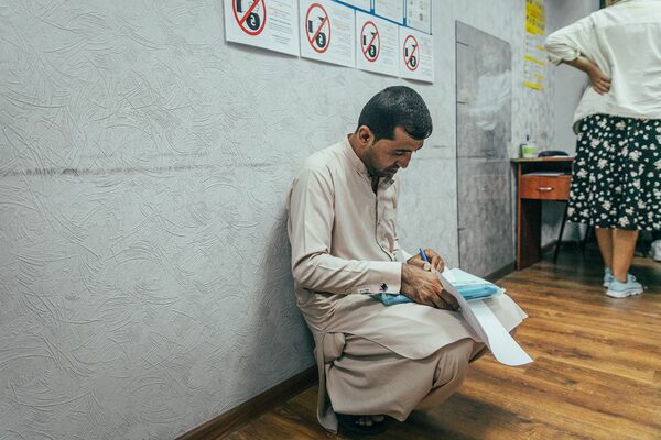 Former Canadian military translator Jawed Haqmal fills out forms at the Migration Office in Kyiv on Sept. 1, 2021.ANTON SKYBA/The Globe and Mail