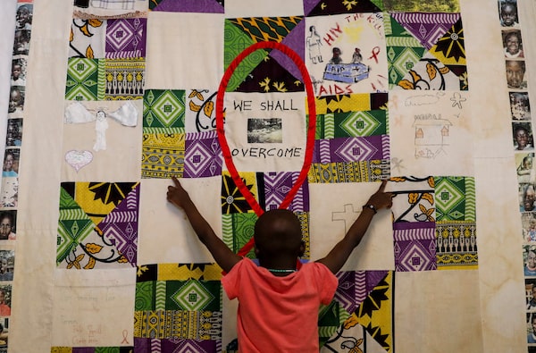 A child plays at an advocacy wall after receiving a dose of antiretroviral ARV drugs used to prevent HIV from replicating, at the Nyumbani Children's Home. The home cares for more than 100 children with HIV, whose parents died of the disease, while providing them with housing, foster care, and PEPFAR supplies of anti-retroviral drugs that accelerate progress toward achieving HIV/AIDS pandemic control, in Karen district of Nairobi, Kenya Feb. 12.Thomas Mukoya/Reuters