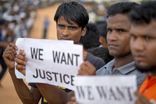 Rohingya refugees holding placards at a camp in Bangladesh.A.M. Ahad/AP