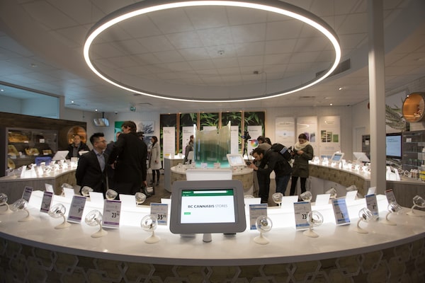 Cannabis, the early years: At top, a B.C. Cannabis Store in Kamloops gets ready to open on legalization day in 2018, and at bottom, cannabis grows at the Thrive Cannabis plant in Simcoe, Ont., this past April.Jeff Bassett/The Globe and Mail; Tara Walton/The Canadian Press