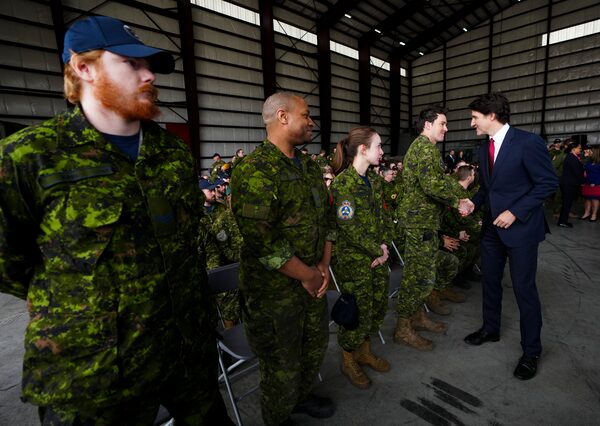 Prime Minister Justin Trudeau shakes hands with troops following a press conference regarding Canada's new defence policy at CFB Trenton, in Trenton, Ont., on April 8.Sean Kilpatrick/The Canadian Press