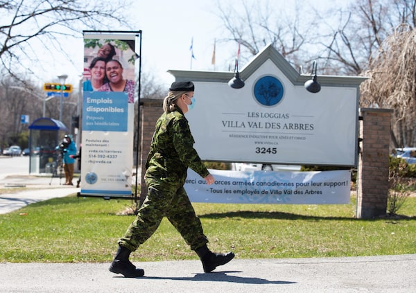Canadian Armed Forces medical personnel arrive at Villa Val des Arbres, a seniors' long-term care centre, to help amid the outbreak of COVID-19, in Montreal, on April 20, 2020.CHRISTINNE MUSCHI/Reuters