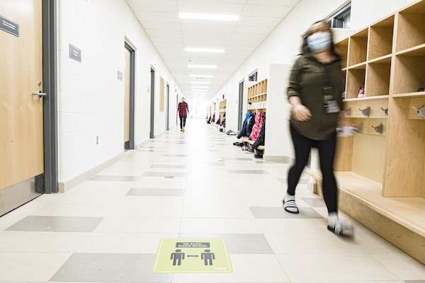 Signs promote physical distancing at a school in Whitby, Ont., during the COVID-19 pandemic, when Canadian educators and students had to quickly pivot to online learning.Christopher Katsarov/The Globe and Mail