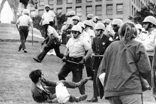 Aug. 26, 1968: Chicago police officers, armed with nightsticks, confront a demonstrator in Grant Park after anti-war protesters climbed a statue of a Civil War general. It was one of many protests during the tumultuous Democratic National Convention being held in that city.The Associated Press/The Associated Press