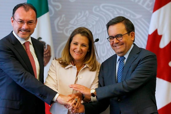 Mexico's Foreign Minister Luis Videgaray, left, Chrystia Freeland and Mexico's Secretary of Economy Ildefonso Guajardo in happier times. (File Photo).Marco Ugarte