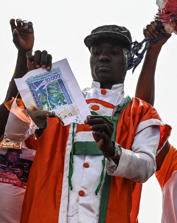 A protester in Niamey burns a printout of the West African CFA franc, a currency Niger shares with several other former French colonies.AFP via Getty Images
