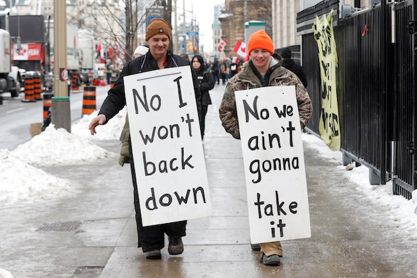 Supporters of the truck convoy carry signs in downtown Ottawa.Lars Hagberg/Reuters