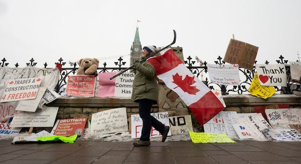 A woman walks past protest signs on Wellington Street in front of Parliament Hill on Feb. 8 as a truck convoy denouncing COVID-19 restrictions continued its blockade.Adrian Wyld/The Canadian Press
