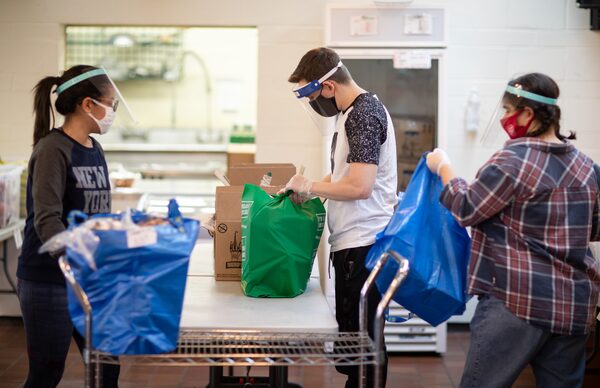 Izabela Jardim, Shawn Switzer, and Ivan Horyn are volunteers at Yonge Street Mission in Toronto, shown packaging bags of food for pickup by appointment.Melissa Tait / The Globe and Mail