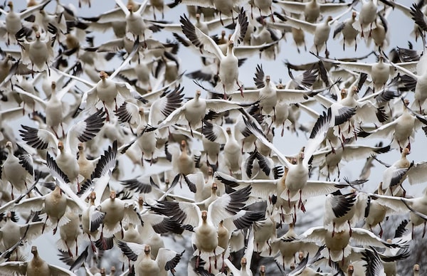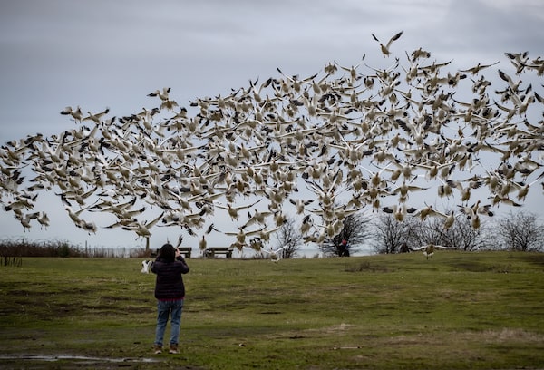 Snow geese take to the air at Garry Point Park, in Richmond, B.C., on Jan. 10, 2021. The B.C. Ministry of Environment estimates 100,000 of the birds reside in the Fraser River Delta every winter.DARRYL DYCK/The Canadian Press