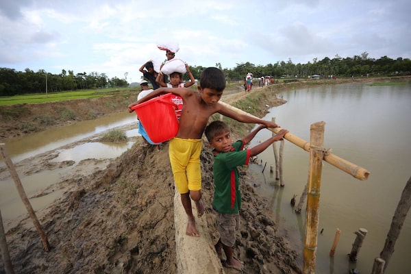 Bangladesh, September, 2017: Rohingya refugees carry supplies along a muddy path after fleeing neighbouring Myanmar. Today, two years of humanitarian crisis have driven hundreds of thousands of Rohingya, a mostly Muslim ethnic minority, into teeming refugee camps.Nathan VanderKlippe/The Globe and Mail