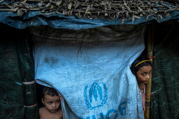 Rohingya refugee children look out from their makeshift home at Kutupalong refugee camp.MUNIR UZ ZAMAN/AFP/Getty Images