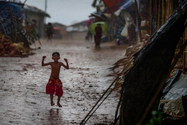 A Rohingya child plays during a monsoon rain at Kutupalong refugee camp on July 23, 2019.MUNIR UZ ZAMAN/AFP/Getty Images