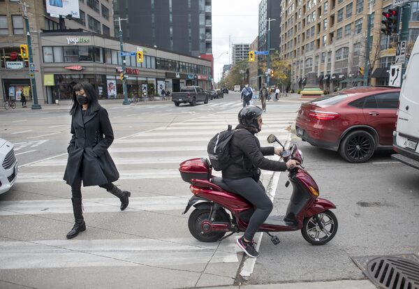 A pedestrian and a rider on an electric bike at the intersection of Spadina Ave. and Richmond St. West in downtown Toronto in 2021.Fred Lum/the Globe and Mail