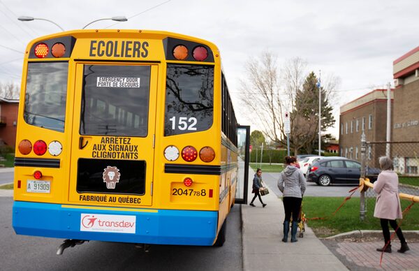 A school bus arrives carrying one student as schools outside the greater Montreal region begin to reopen their doors amid the COVID-19 outbreak, in Saint-Jean-sur-Richelieu, Quebec, May 11, 2020.CHRISTINNE MUSCHI/Reuters
