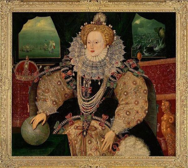 Elizabeth I, shown in the so-called Armada Portrait commemorating England's defeat of a Spanish invasion force, shown in ruins behind her.The Art Fund via AP